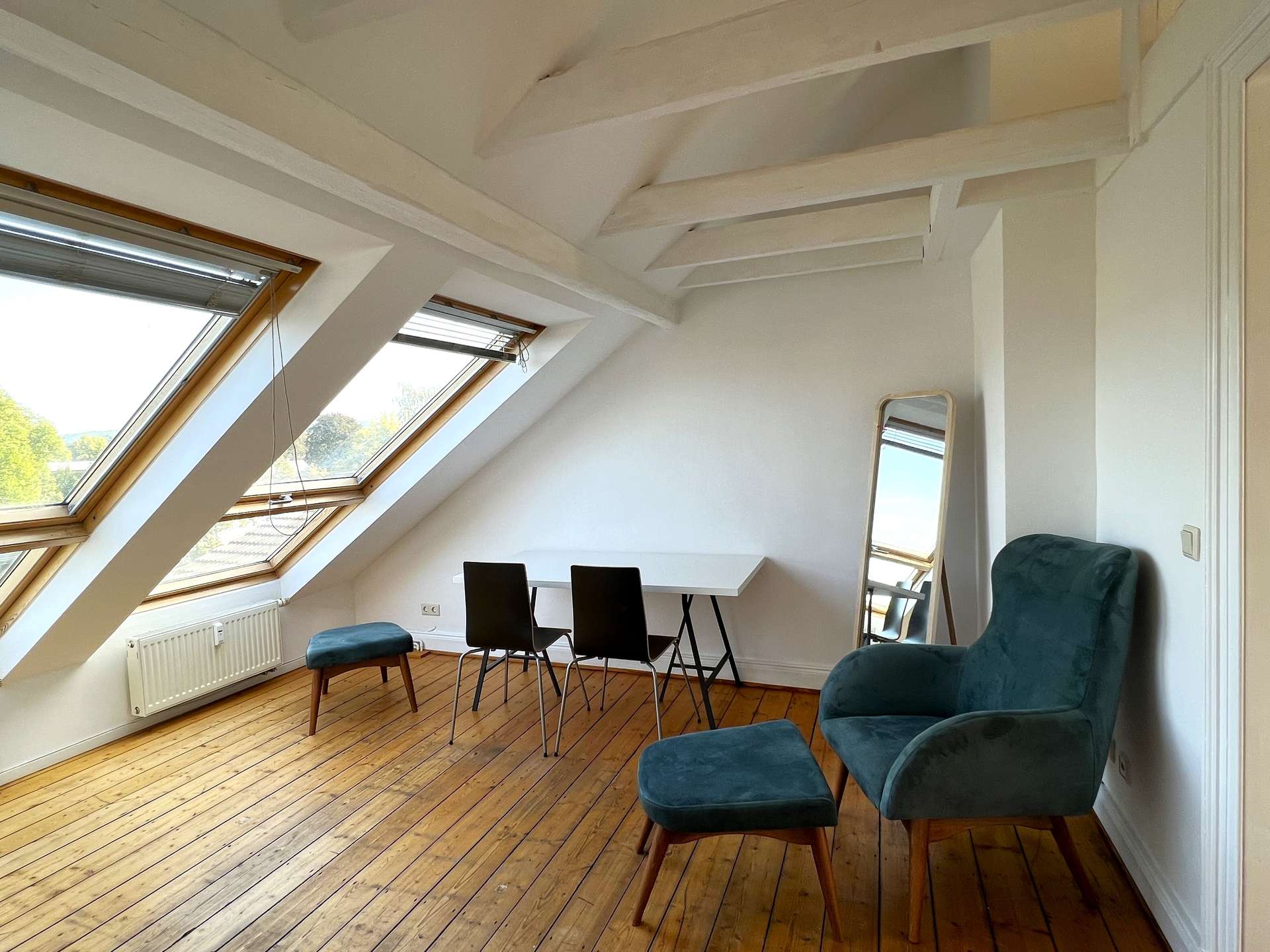 Auf rund 90 m² erwarten Sie drei geschmackvoll möblierte Zimmer, die mit eleganten Dielenböden und liebevoll erhaltenen Kassettentüren den Charme der Gründerzeit widerspiegeln. Dank der großzügigen Fenster ist die Wohnung lichtdurchflutet und eröffnet Ihnen zudem einen herrlichen Blick auf die Godesburg – ein echtes Highlight im Alltag.